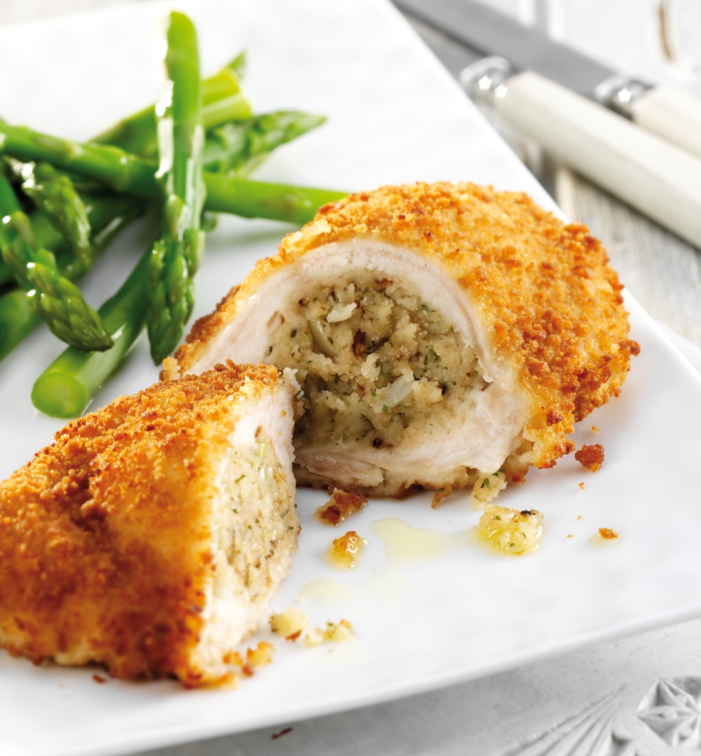 Chicken breast fillet, filled with sage and onion stuffing and coated in crispy Gluten Free golden breadcrumbs.