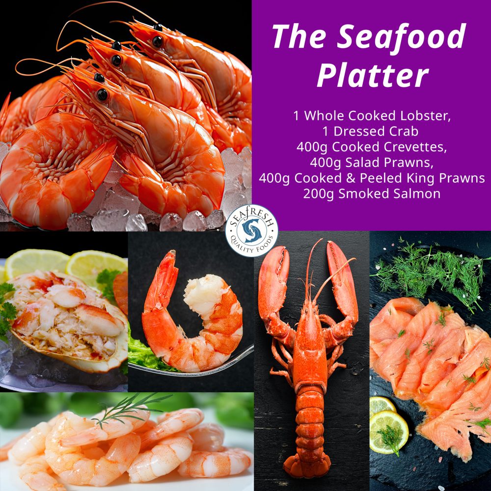 One Whole Cooked Lobster, One Dressed Cromer Crab, 400g of Cooked King Prawns, 400g of Cooked Crevettes, 400g of Salad Prawns and 250g of our finest Smoked Salmon.