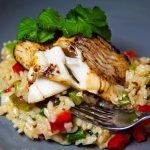 10. Serve a generous portion of the cooked risotto onto a plate and place the cod loin on top. Garnish with fresh coriander and enjoy!