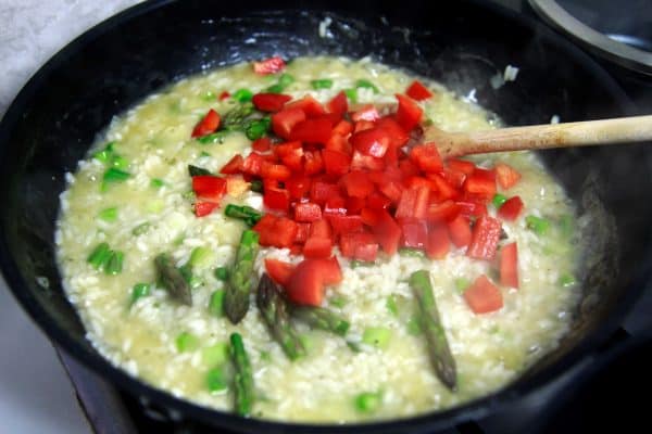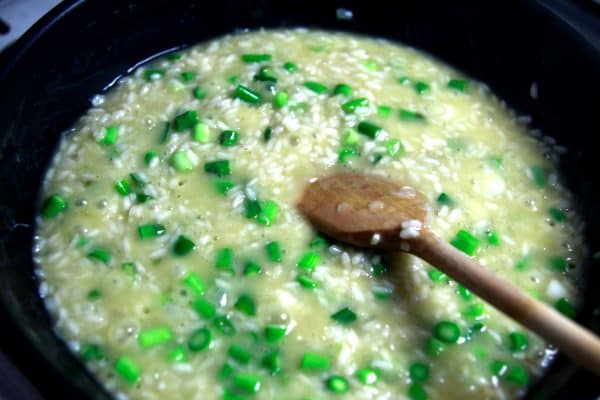 5. When you've added the last cup of stock add the chopped asparagus and the chopped spring onions. Cook for 5 mins. (keep the tips of the asparagus to one side)