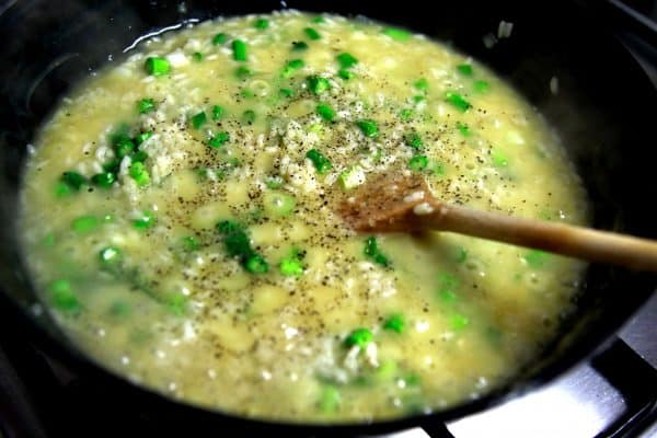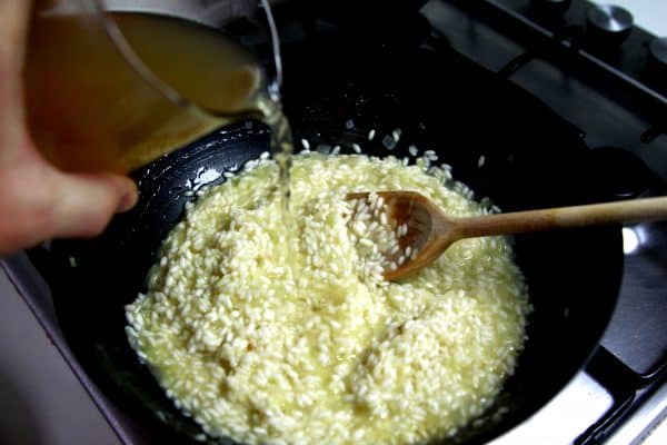 4. Now add the vegetable stock a cup full or ladle full at at time. Let the rice absorb the stock each time before adding the next lot.