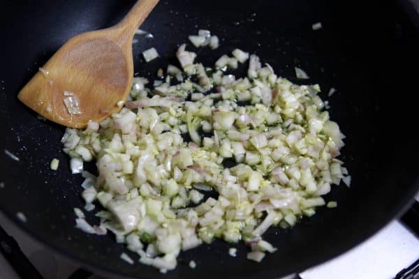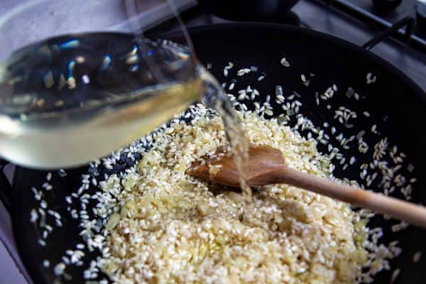3. Add the white wine. Cook on a higher heat until the wine has been absorbed.