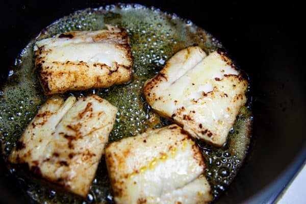 8. Pan fry the cod loins in oil and butter for 5 mins . Medium to hot heat let the butter brown and baste the Cod with the butter.