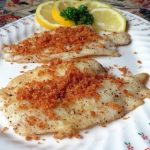 - Heat the olive oil along with 1 TBS of butter in the skillet over medium high heat until the butter begins to foam, swirling them to mix together. Add the fish fillets, presentation side down. Cook quickly, browning on both sides and allowing no more than 2 minutes per side. Place onto a heated serving platter, scatter the crispy bread crumbs over top and garnish with lemon wedges. Serve immediately.