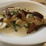 - Remove the baking paper and add the pre cooked sliced potatoes. Warm through for a further 5 mins then serve. Top with the crispy bacon strips and garnish with a little more chopped parsley and a slice of lemon.
