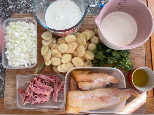 Naturally Smoked Cod poached in milk & cream with chopped onions & sliced new potatoes .