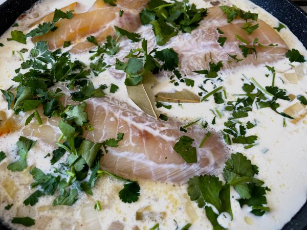 - Add the Smoked Cod along with the cream, milk, chopped parsley and the bay leaves to the pan and bring to a gentle simmer. Add seasoning and cover with a sheet of baking paper. Poach for approx 7 - 8 mins on a gentle heat.