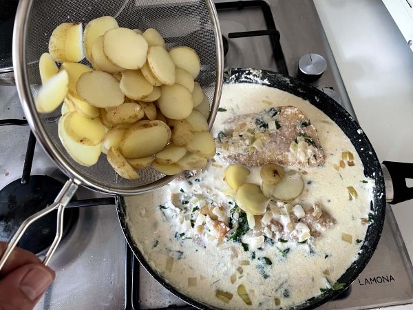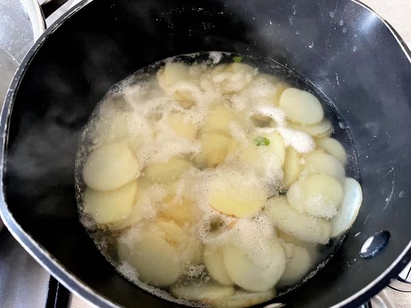 - Cook the sliced potatoes in salted water until soft. then drain before adding to the poaching mix.
