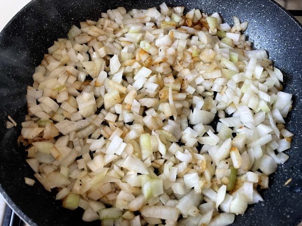 - Gently fry the chopped onions in the same oil for 2 -3 minutes without colouring.