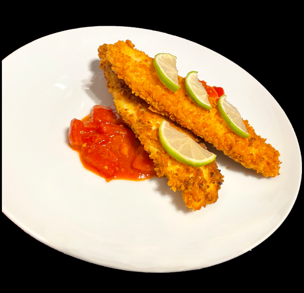 5. Shallow fry in the vegetable oil for 2 minutes each side until the crumb is golden brown. Place the fillets on kitchen towel to remove any excess oil. Serve on a hot plate along with the Spicy Salsa (Salsa can be warmed or served cold). Squeeze the juices of the limes over the fish and decorate with a few lime slices